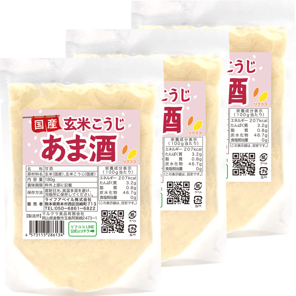 | 商品情報 | ・米問屋から始まり、こうじ製造を開始したのは昭和3年。 それから創業90年以上の麹専門のメーカーにより製造しており、地元岡山・広島の「玄米と玄米こうじ」の原料だけを使い職人技で仕上げた自信の玄米こうじ甘酒です! リフココの甘酒の特徴は ・「保存料」「酸化防止剤」「着色料」「防腐剤」などの添加物は不使用。 ・ノンアルコールで、砂糖も一切不使用。 ・切り口もノッチ付きのパッケージで、お客様が開けやすい物を採用。 ・使い切りサイズなので、1袋を使い切ったらそのまま捨てるだけのエコ仕様。 などなど小さなお子様から妊婦さんにも、安心して広く皆様に召し上がって頂きたく、 製造にこだわり抜いた商品です! |