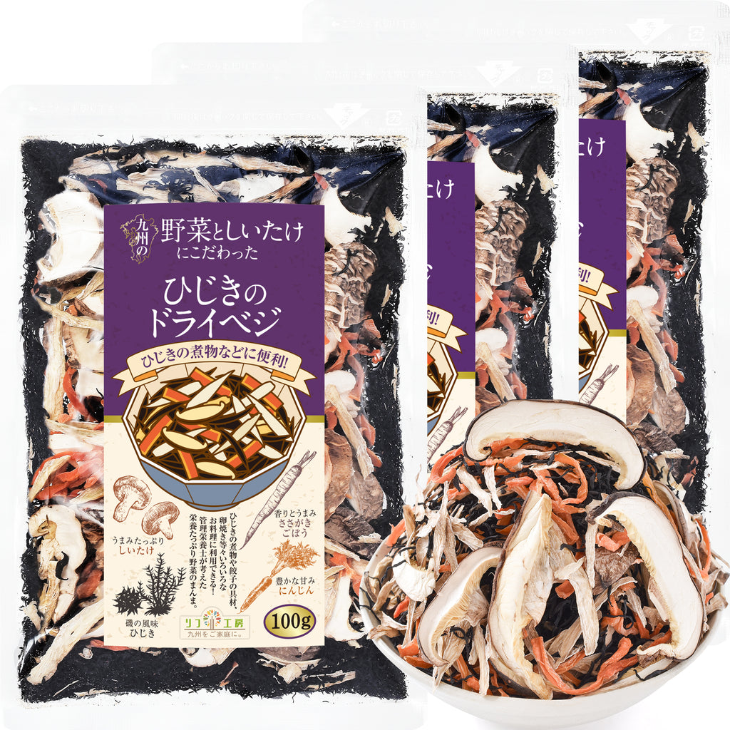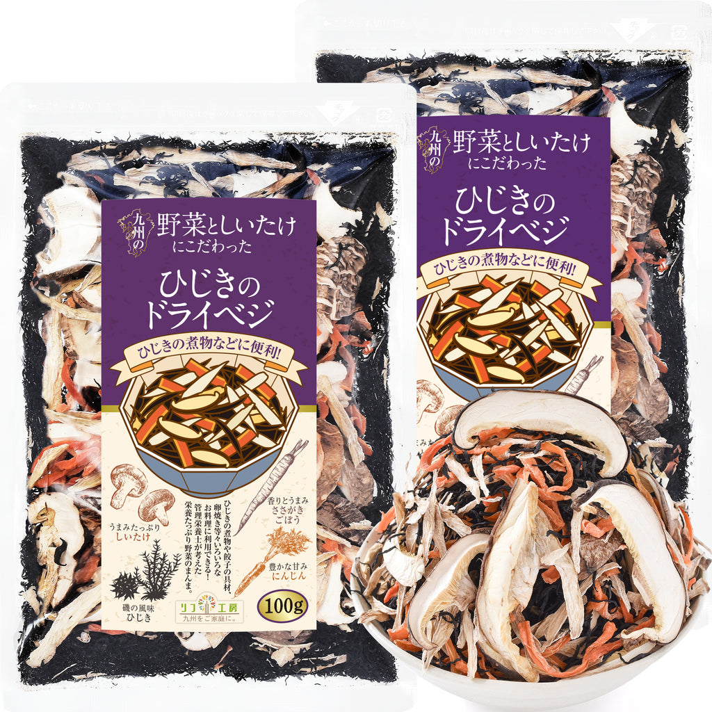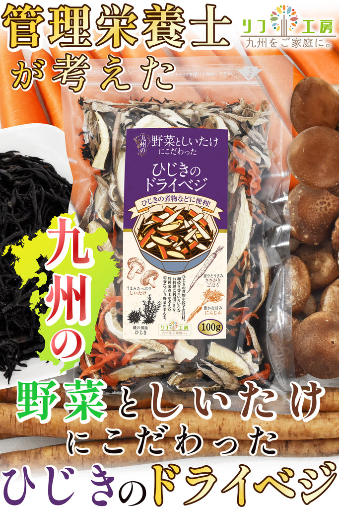 リフ工房管理栄養士監修 国産 乾燥野菜 九州の野菜としいたけにこだわった ひじきのドライベジ 100g/100g×2袋セット/100g×3袋セット 原木しいたけ ひじき ささがきごぼう 人参 保存食 カップ麺の具 味噌汁の具 野菜スープ エアーズドライ製法 フリーズドライ 野菜 乾燥野菜 国産 九州産のみ使用 残留農薬検査実施済み